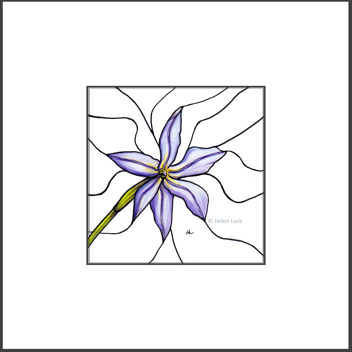 I called this watercolour and ink painting ‘Wild One’ because all of my attempts to identify the wild flower have failed.  I drew and painted it from a lone bloom that appeared in our Perth Hills garden in Spring.  It was small (about 2cm in diameter), delicate in appearance, on a thin, relatively long, upright stem that swayed in the breeze.  I’ve learned that it helps to identify flowers to include other plant parts!  I’ll be on the look out for it next spring.