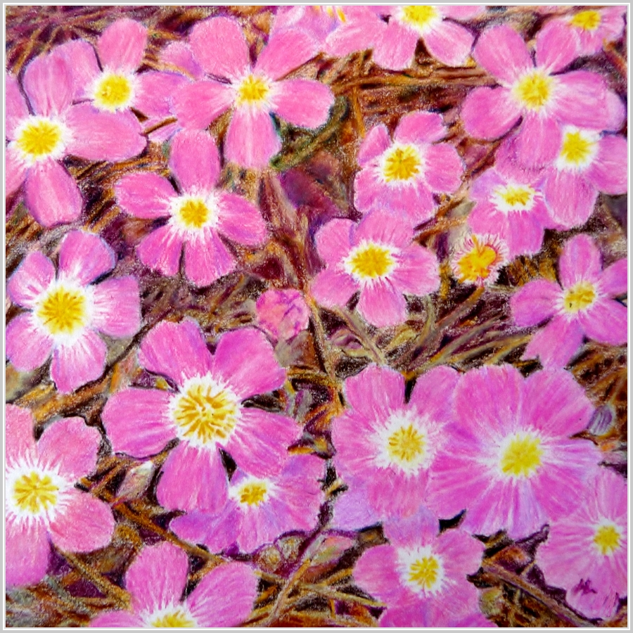 My painting was inspired by seeing a carpet of these flowers on a beautiful, sunny, Spring morning in the Julimar State Forest north east of Perth in WA. The original is 9cm square and worked with Prismacolor pencils on paper.
