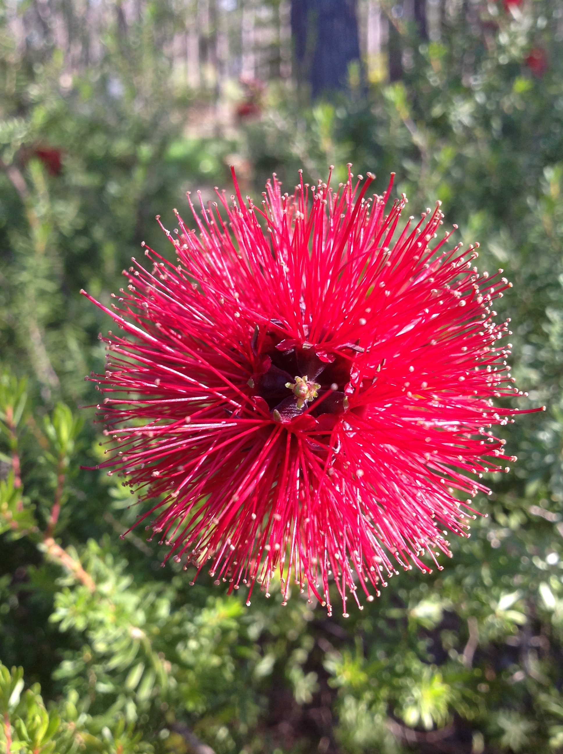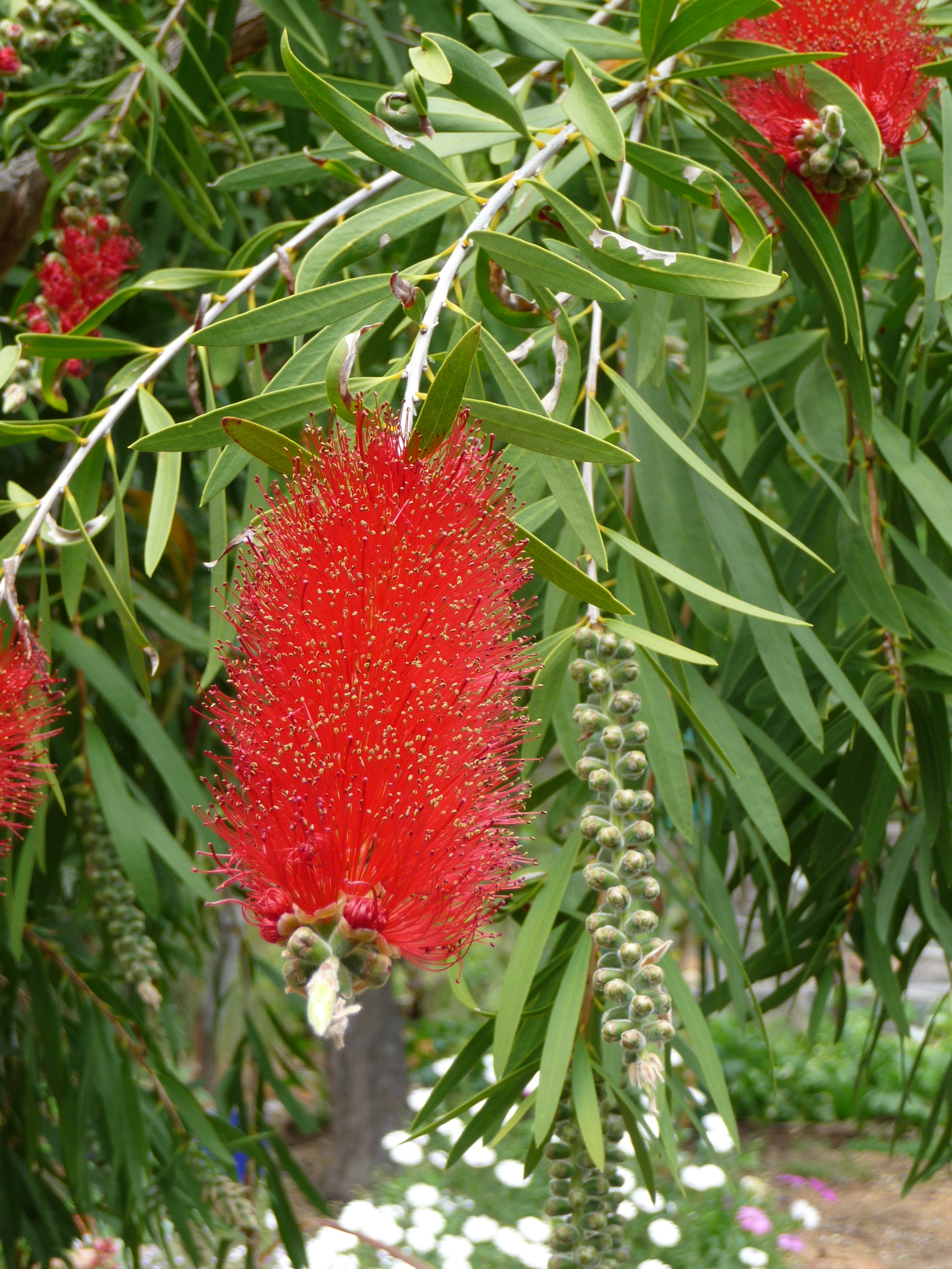 discovered that is is a Kunzea. One has to look closely to see the differences though! Kunzea leaves tend to be smaller than those of Callistemons and the five sepals and petals are deciduous in the Kunzea and persistent in Callistemons. They are closely related. Here is a photo of each taken in our garden this Spring.