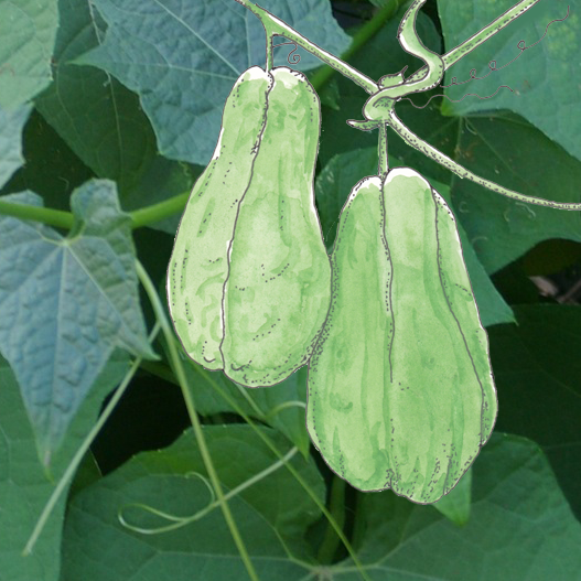 With a photographic background of choko leaves: