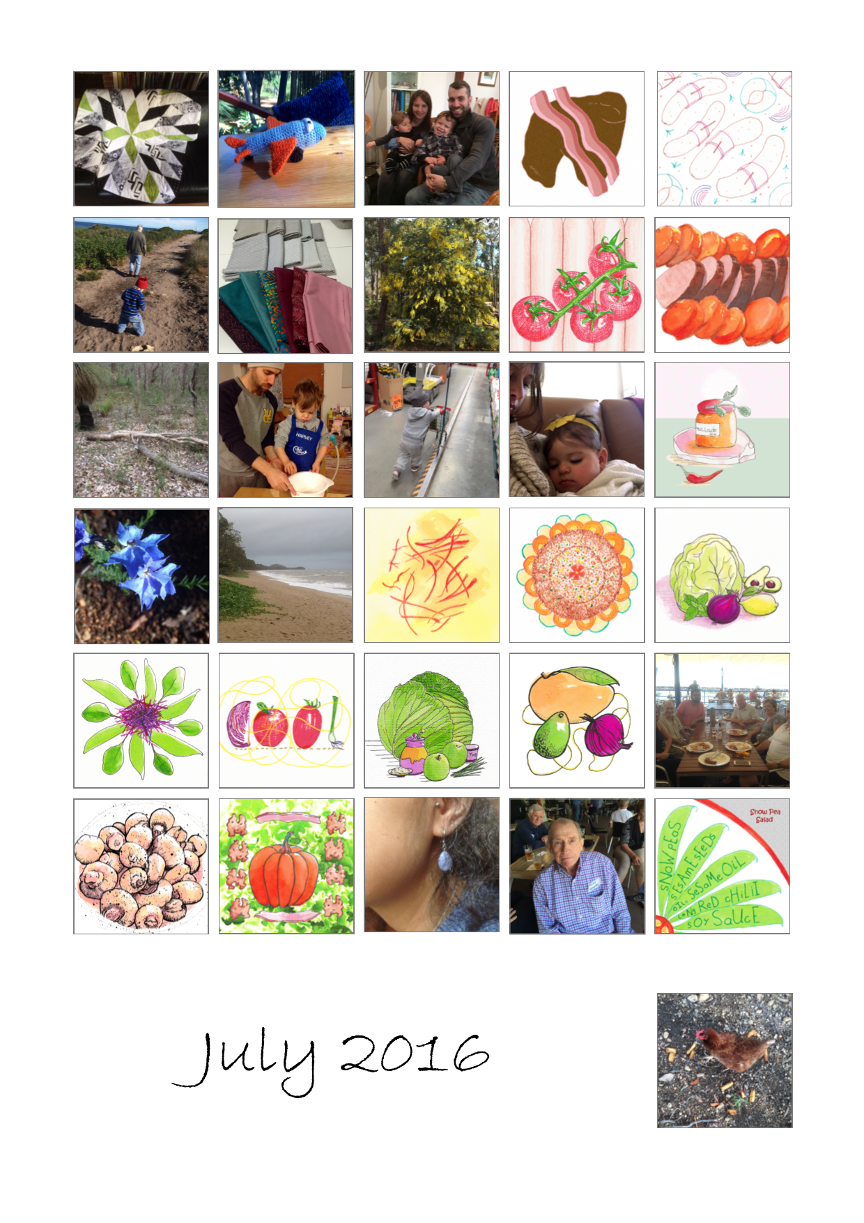 As I compiled the photo collage representing my month of July 2016 I was struck by how little it told of the whole.  In truth, disappointment, sadness, worry and illness dominated our July, yet my visual diary communicates only creativity, gifts, the beauty of nature and happy occasions with family and friends!