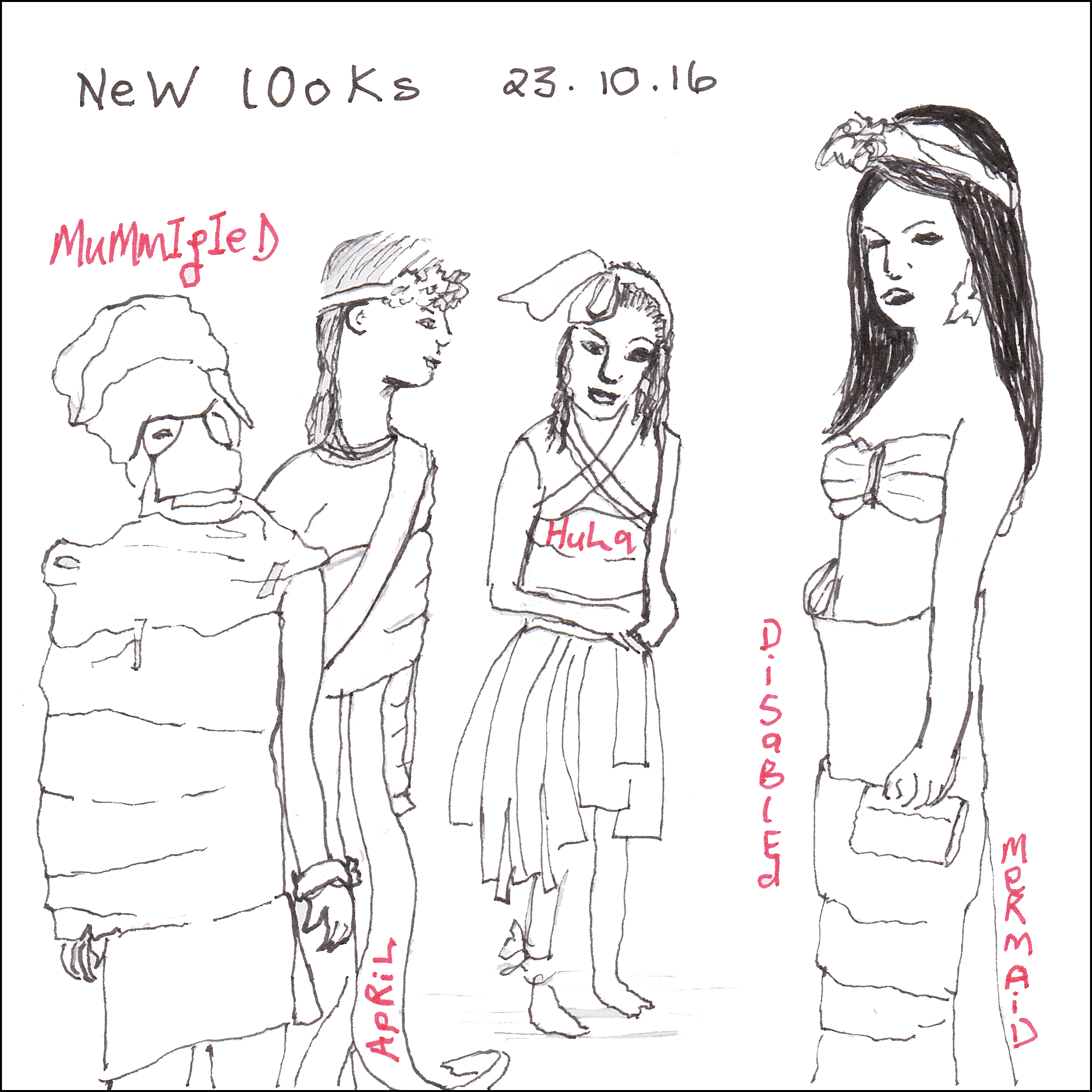 A quick sketch to recall the fun had on day 23 of Inktober: granddaughters, their cousins and friends in a frantic contest to create a winning design out of toilet paper and masking tape!!