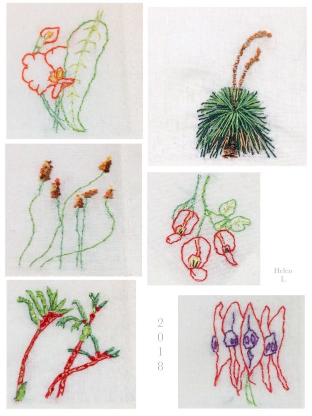 I used some of my wildflower painting designs as embroidery motifs for a set of napkins while stitching as a passenger – travelling home to Western Australia.