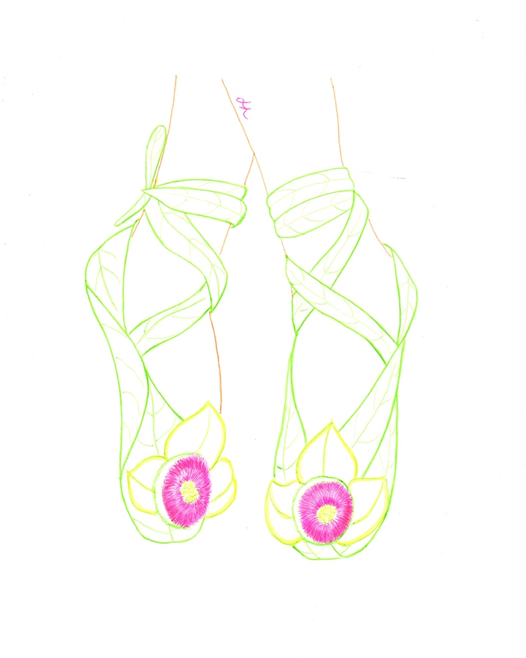 Having previously combined my love of wildflowers and interesting footwear in my wildflower shoe designs, I thought why not also throw in my love of dancing…. so here are ballet shoes inspired by Eucalyptus Macrocarpa flower buds and gum leaves – rendered in ballpoint pen.