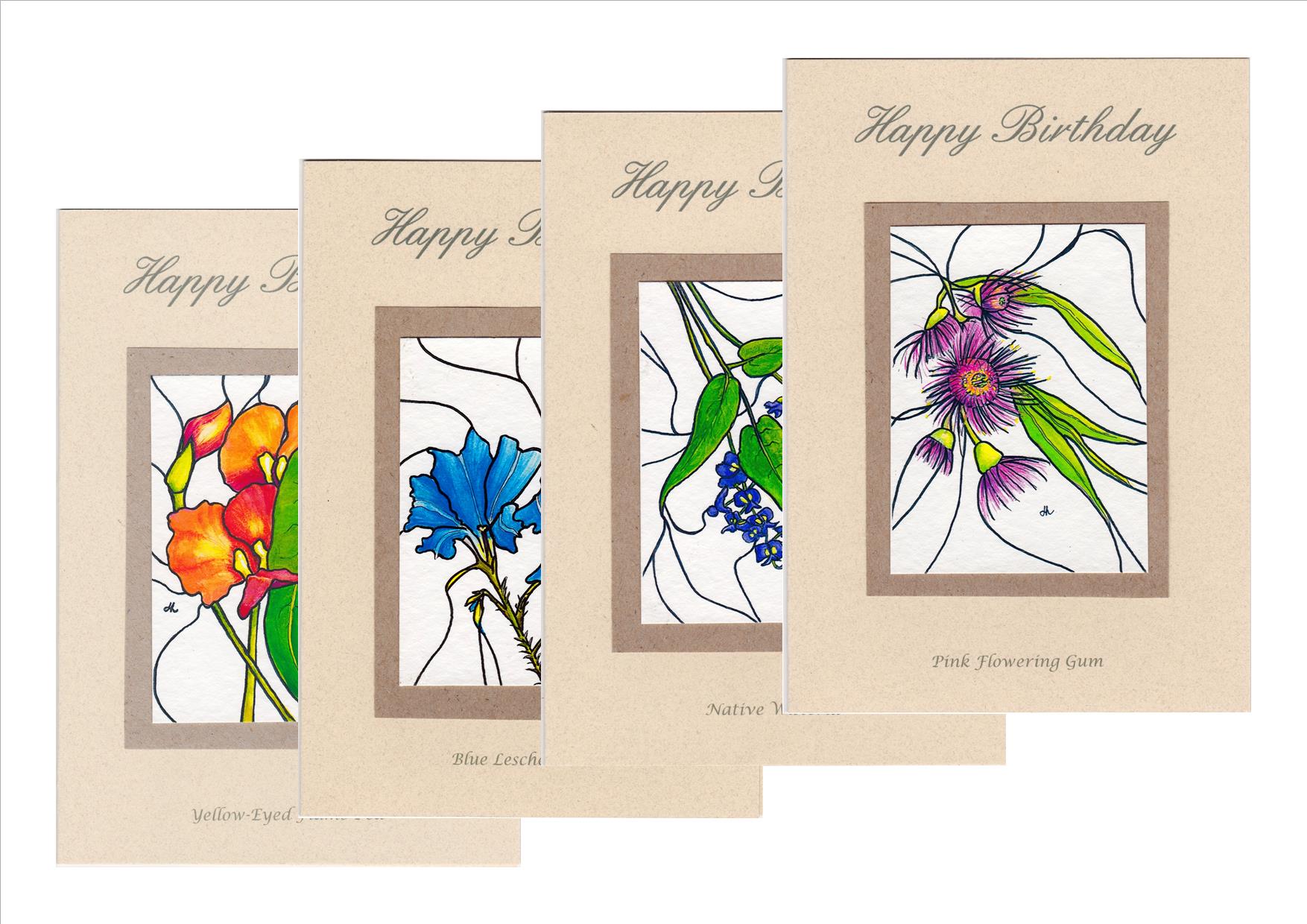 I painted these watercolours from wildflowers in our garden.  I decided to highlight the flowers by isolating them as if they were preserved in a stained glass window with dynamic lead lighting to give the feel of the breeze or the tangle of the bush.