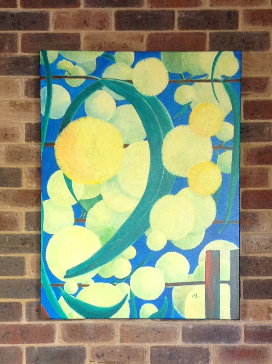 It is 1000 by 750 cm in size and painted in the same palette of acrylic paints as the Pincushion Hakea Laurina and others, as they were designed to be hung in the same location. This painting taught me to be careful when choosing colours to paint shadows on yellow objects – it is too easy to end up with dull, dirty looking ones. After trying the complement of yellow (violet) I found a touch of Cadmium Red Light for warm shadows and a touch of Phthalo Green or Blue for cool shadows worked better.